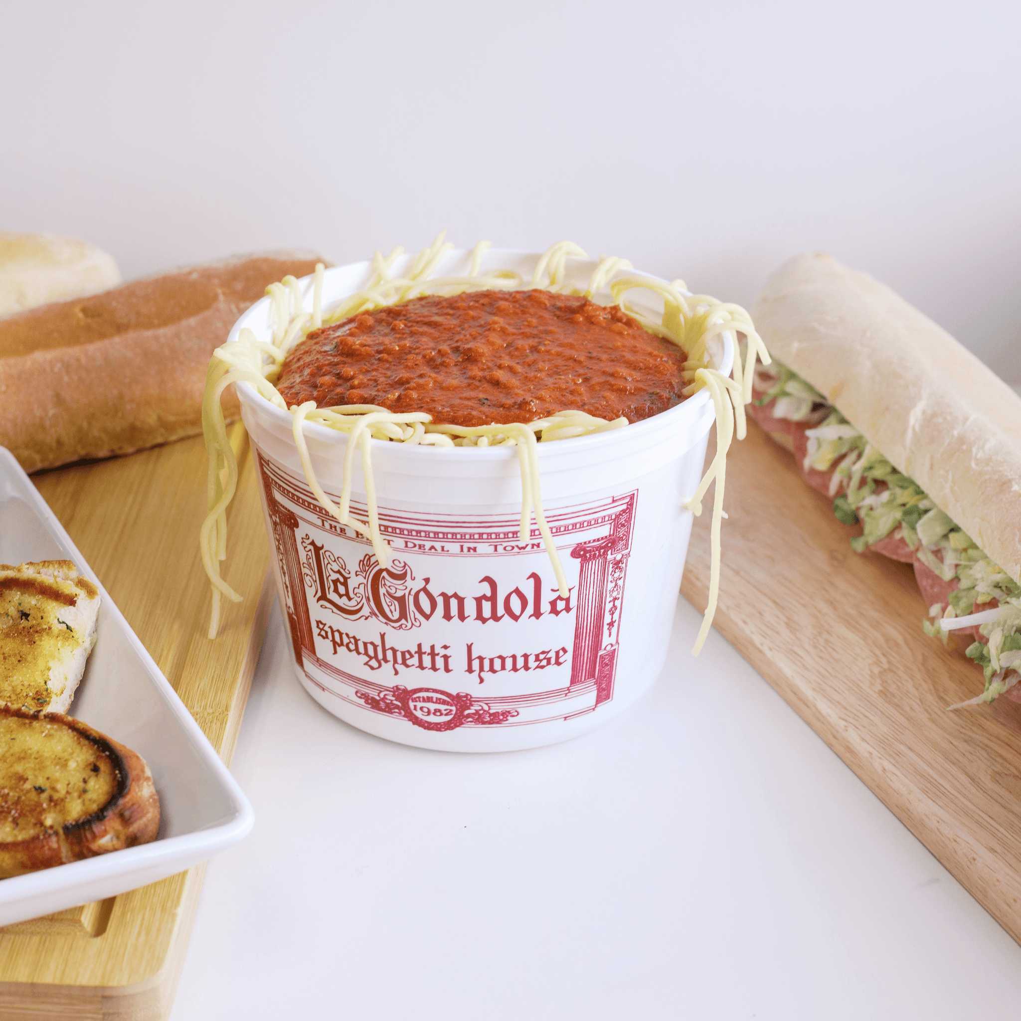 Half gallon spaghetti, 16" garlic bread, 16" torpedo and fresh bread or 32 oz. drink
