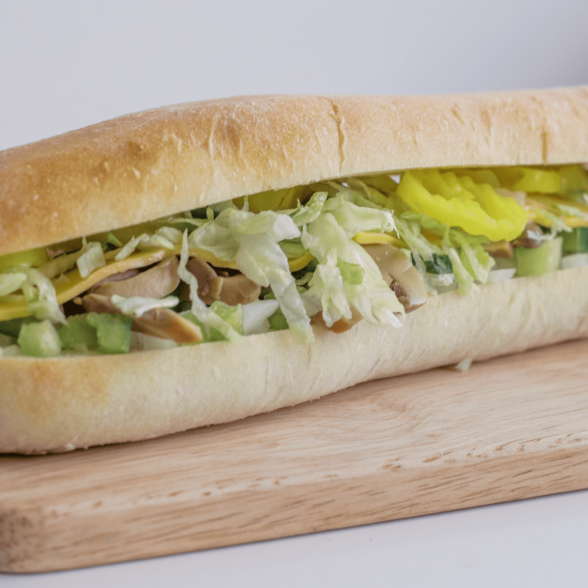 A vegetable explosion. American cheese, diced onions, mushrooms, green peppers, mild banana peppers and lettuce on our fresh baked bread.