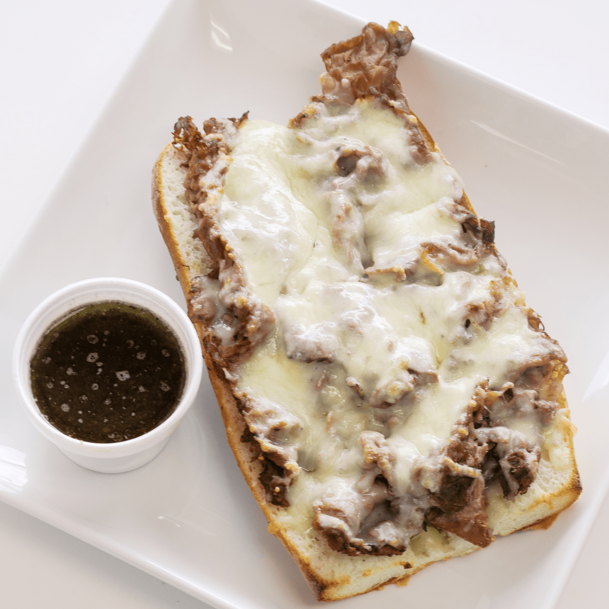 A select cut of roast beef which is sliced thin and piled high, then topped with melted cheese
